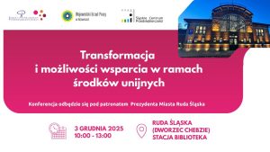 Zapraszamy do udziału w konferencji „TRANSFORMACJA REGIONU I WSPARCIE Z FUNDUSZY EUROPEJSKICH”, która odbędzie się 3 grudnia 2025 r. w godz. 10:00–13:00 w Stacji Biblioteka w Rudzie Śląskiej (Chebzie), ul. Dworcowa 33....