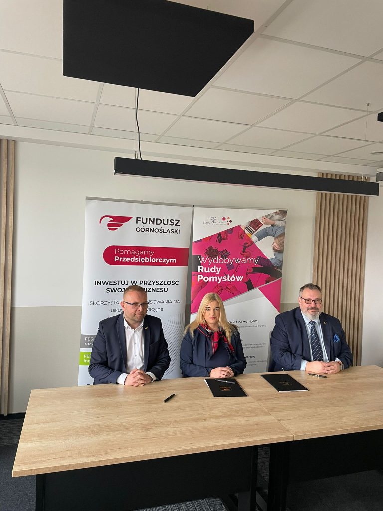 Porozumienie podpisali Prezes Zarządu Śląskiego Inkubatora Przedsiębiorczości Izabela Moczko oraz Prezes Zarządu Fundusz Górnośląski S.A. Mateusz Rykała wraz z Wiceprezesem Zarządu Mariusz Mandat.