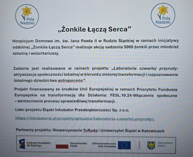 Inicjatywa „Żonkile łączą serca” była działaniem społecznym realizowanym w okresie od kwietnia do października 2025 r. na terenie miasta Ruda Śląska. Projekt łączył włączenie społeczne, edukację ekologiczną, integrację międzypokoleniową oraz budowanie lokalnej wspólnoty, a jego głównym celem było stworzenie symbolicznej przestrzeni solidarności, empatii i wsparcia dla Hospicjum Domowego. Sadzenie żonkili stało się czytelnym znakiem troski o osoby chore, a jednocześnie trwałym, estetycznym elementem przestrzeni publicznej. Inicjatywa aktywizowała dzieci, młodzież, seniorów oraz mieszkańców, wzmacniając więzi społeczne i postawy wolontariackie.